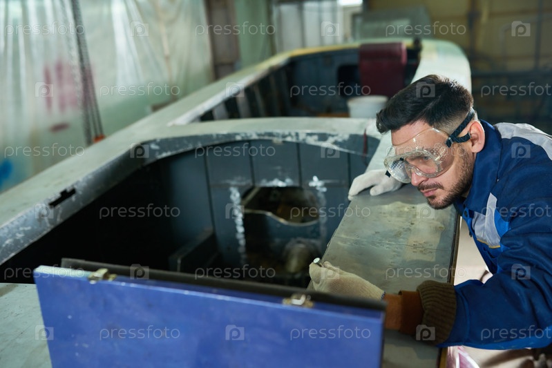 Красивый мужчина ремонтирует лодку в мастерской