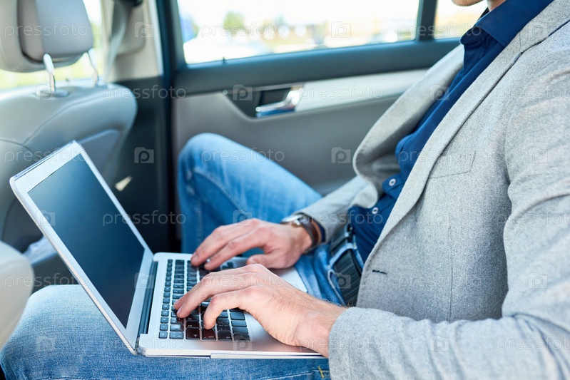 Бизнесмен, использующий ноутбук в машине Close Up