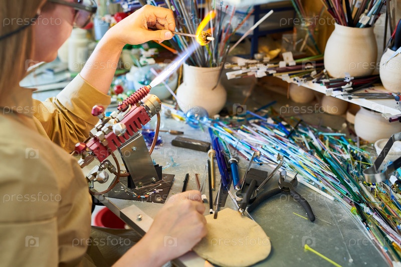 Художница-женщина, формирующая стекло в пламени