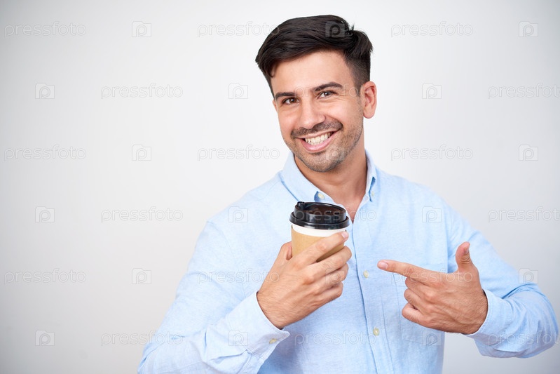 Мужчина, рекламирующий вкусный кофе