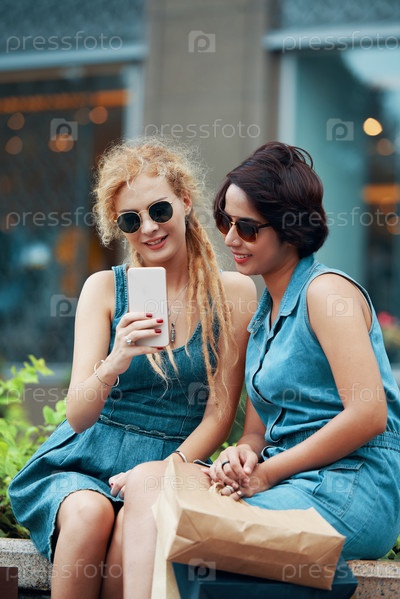 Стильные подруги с сумками для покупок и смартфоном
