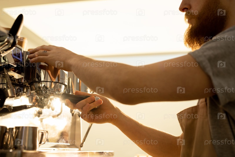 Мужчина-бариста прикрепляет портафильтр к эспрессомашине