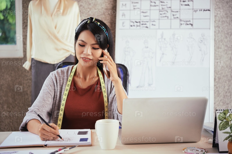 Азиатский портной разговаривает по телефону и рисует