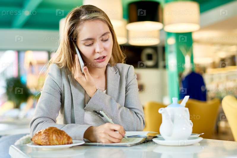 Молодая бизнесвумен разговаривает по телефону в кафе