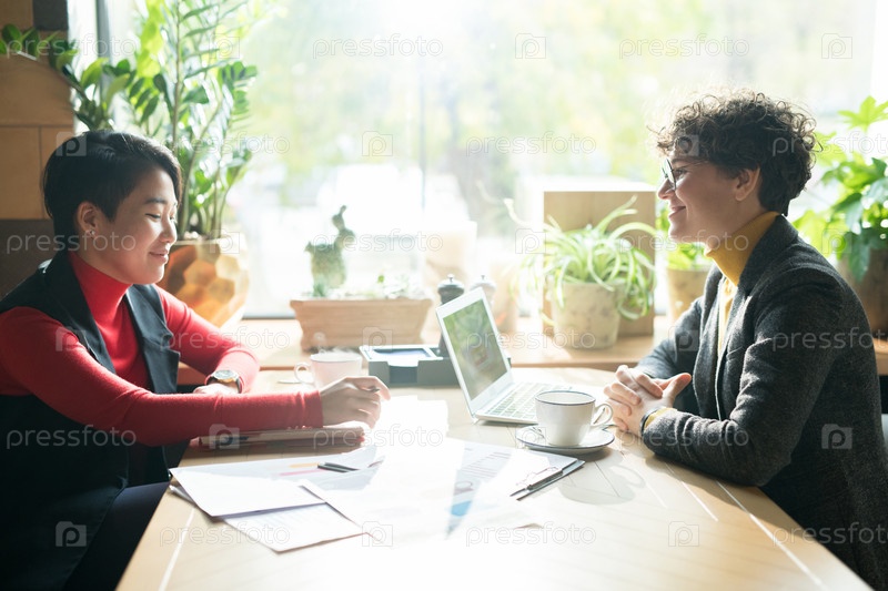 Бизнес-женщины обсуждают отчет о контенте в кафе
