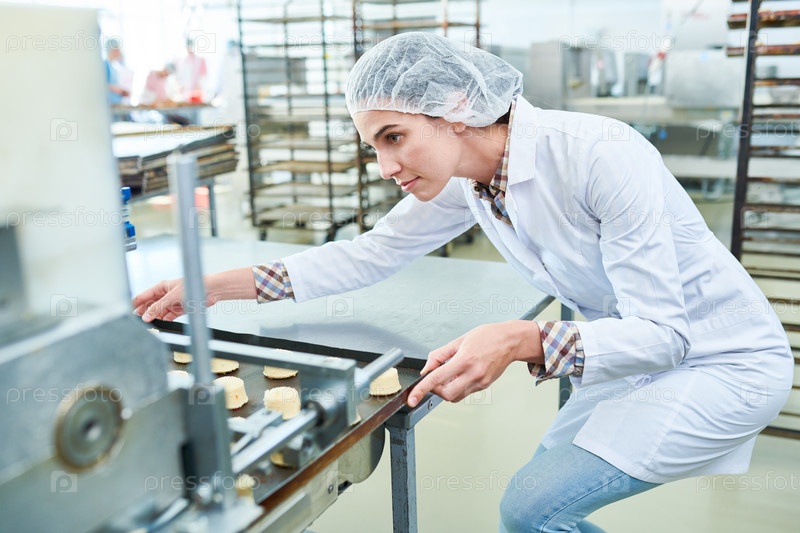 Кондитер, держащий поднос с выпечкой во время работы машины