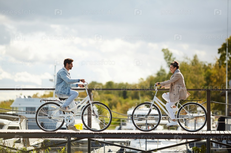 Веселая пара едет на велосипеде по узкому деревянному пиру