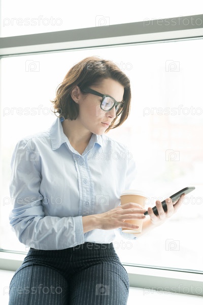 Серьезная деловая леди проверяет сообщение по телефону