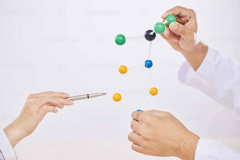 Ученые-культурщики с молекулярной моделью на белом фоне