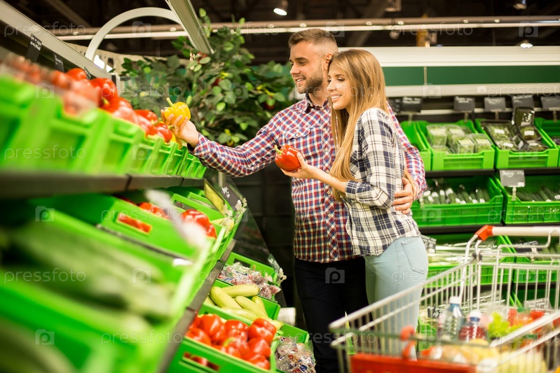 Счастливая пара вместе покупает продукты