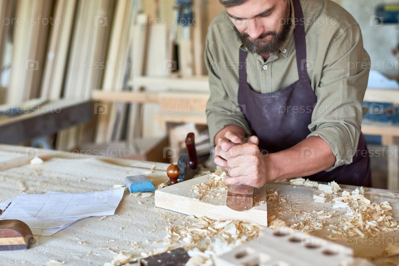 Плотник, работающий в традиционной деревообрабатывающей мастерской