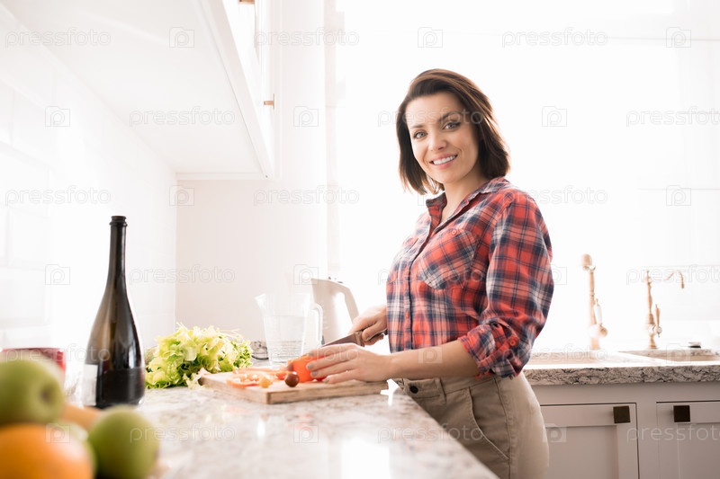 Молодая женщина готовит еду дома