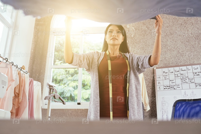 Азиатский портной кладет ткань на стол