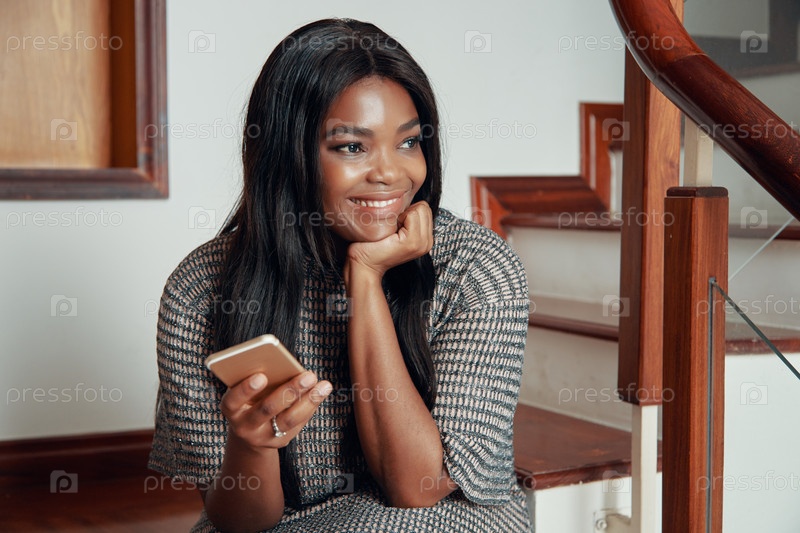 Улыбающаяся чернокожая женщина сидит со своим телефоном на лестнице