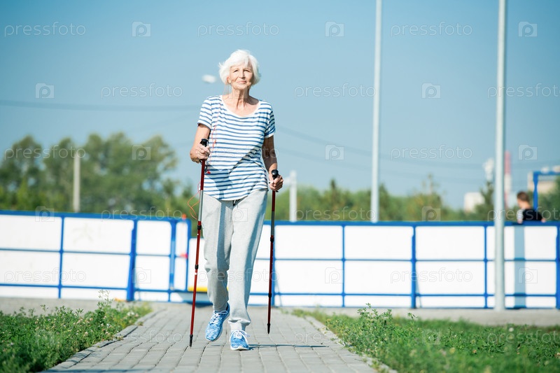 Старшая женщина скандинавская ходьба Happy