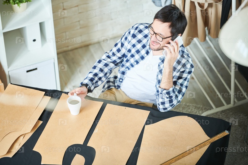 Веселый мужчина в ателье разговаривает по телефону
