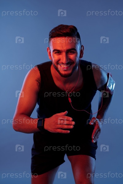 Веселый спортсмен, бегущий в наушниках