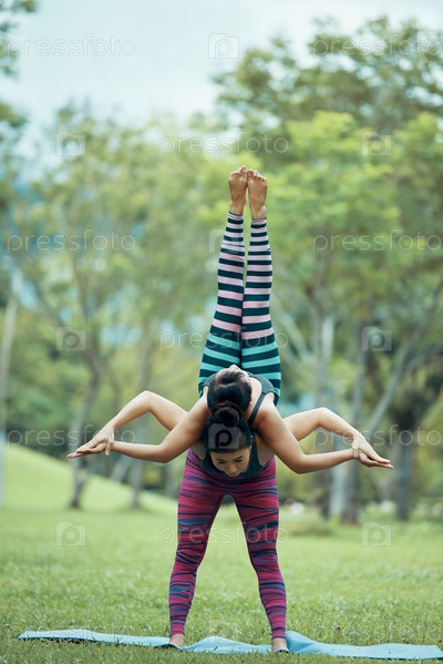 Спортивные азиатские девушки практикуют акройогу в парке