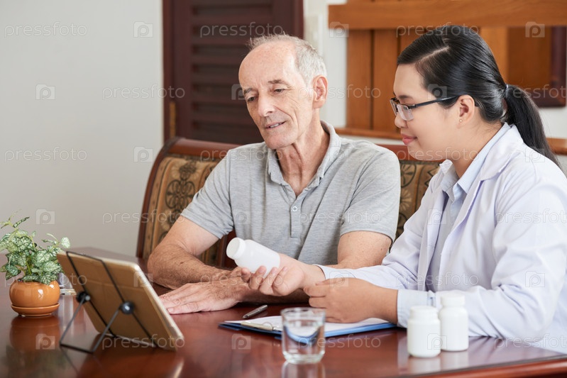 Пожилой пациент смотрит планшет с врачом