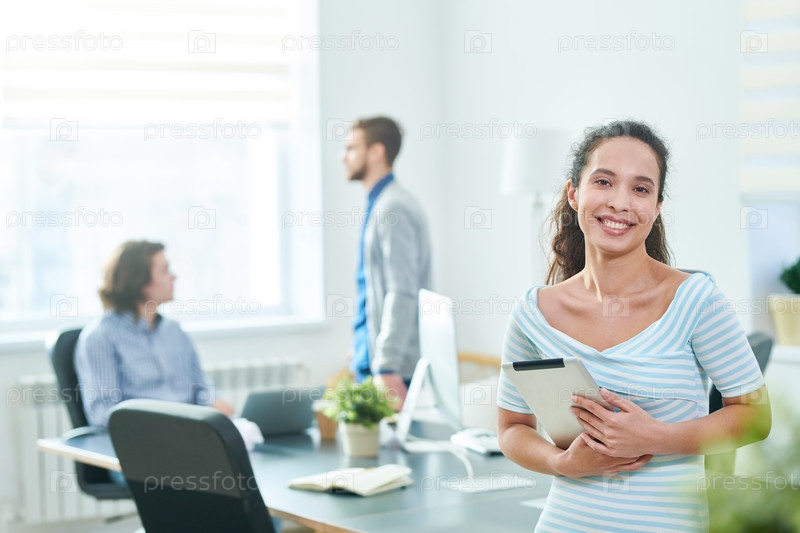 Веселый красивый специалист с планшетом