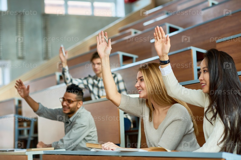 Студенты, поднимающие руки в классе