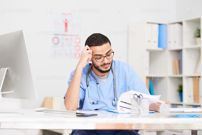 Пенсивный ближневосточный врач, сидящий за столом