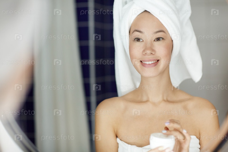 Красивая женщина наносит крем для кожи лица