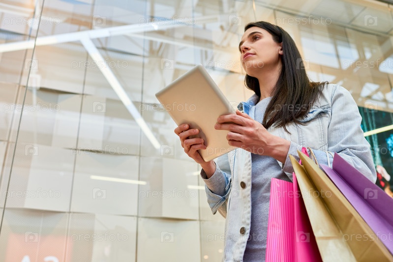 Уверенная модная девушка, находящая магазин в торговом центре