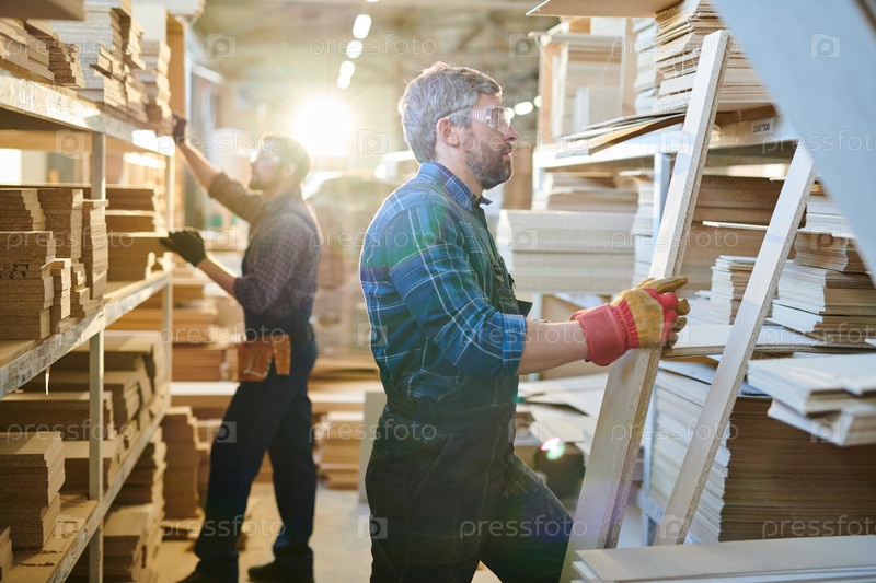 Седой ручной рабочий проверяет деревянные доски на складе