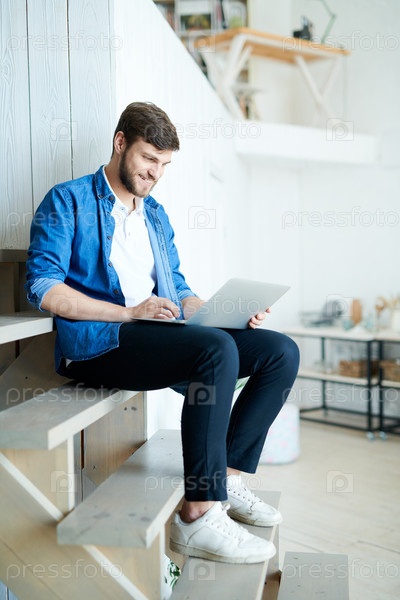 Красивый молодой человек, использующий ноутбук дома