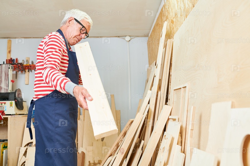Пожилой плотник смотрит на деревянную доску