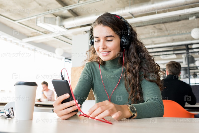 Счастливая девушка, использующая мобильное приложение в офисе на открытом пространстве