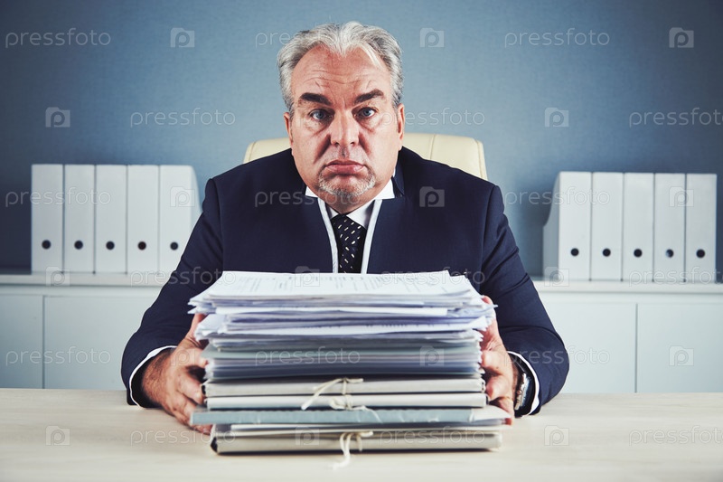 Усталый пожилой бизнесмен с кучей документов