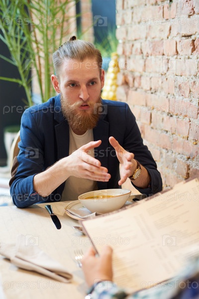 Бородатый мужчина разговаривает с коллегой в кафе