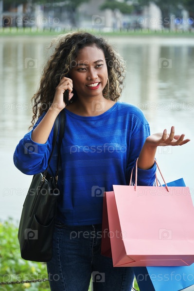 Веселая индонезийская женщина разговаривает по телефону во время покупок