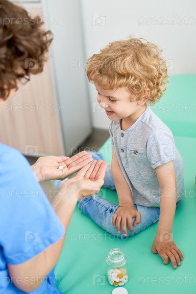 Медсестра дает витамины счастливому мальчику