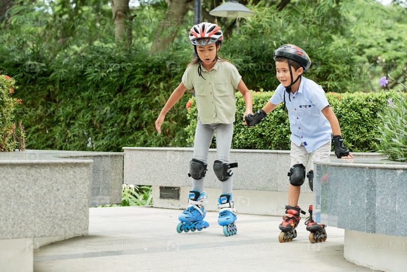 Азиатские дети катаются на роликах в парке