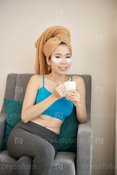 Азиатская женщина с подушками под глазами пьет