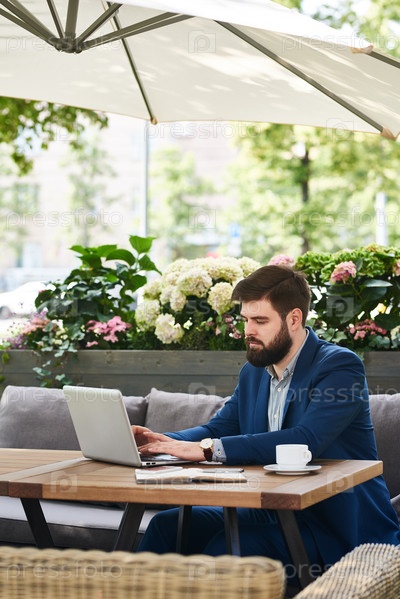 Бизнесмен, работающий с современным ноутбуком на открытом воздухе