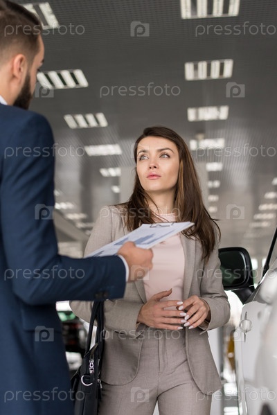 Красивая женщина, выбирающая новый автомобиль