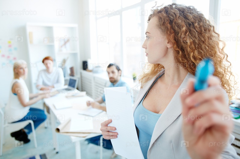 Привлекательный оратор, представляющий информацию на тренировочном классе