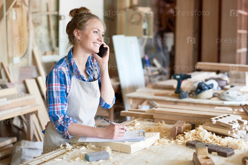 Молодая женщина говорит по смартфону в современной столярной посуде