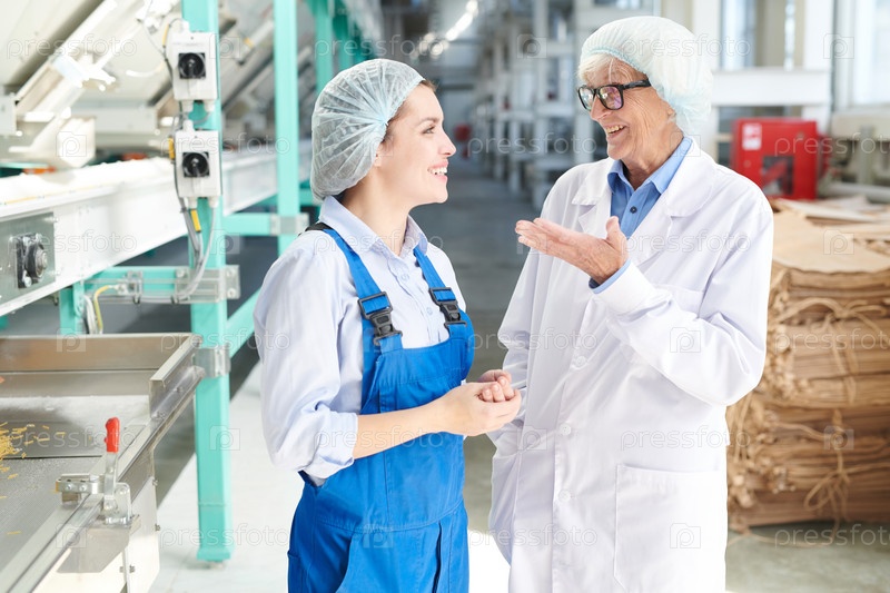 Веселые рабочие на пищевой фабрике