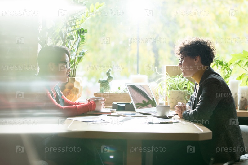 Серьезные деловые дамы обсуждают маркетинговый проект