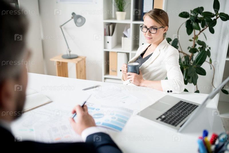 Уверенная в себе леди с кружкой разговаривает с финансовым советником в офисе