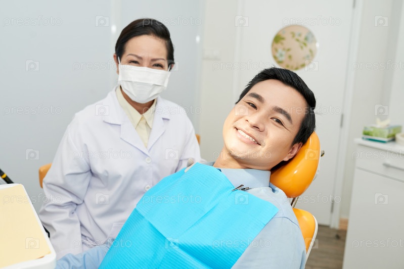 Улыбающийся этнический стоматолог и мужчина в стоматологическом кресле