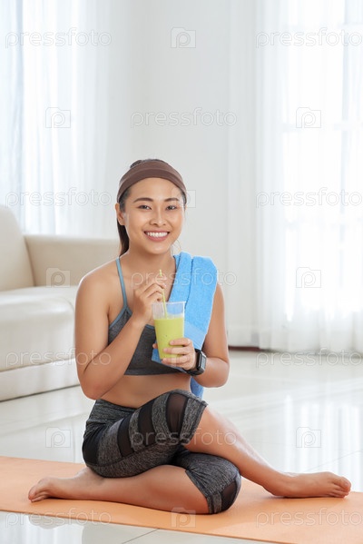 Улыбающаяся этническая спортсменка с смузи
