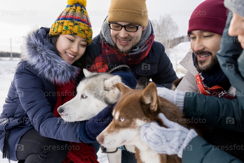 Молодые пары играют с хаски-собаками