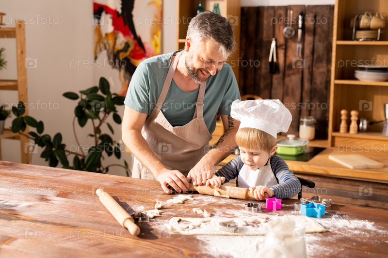 Веселый отец учит сына варить тесто