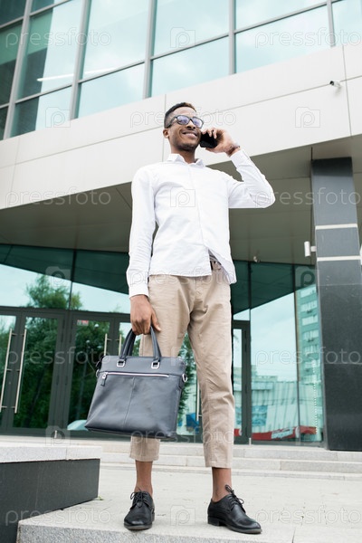 Веселый красивый бизнесмен ходит и разговаривает по телефону